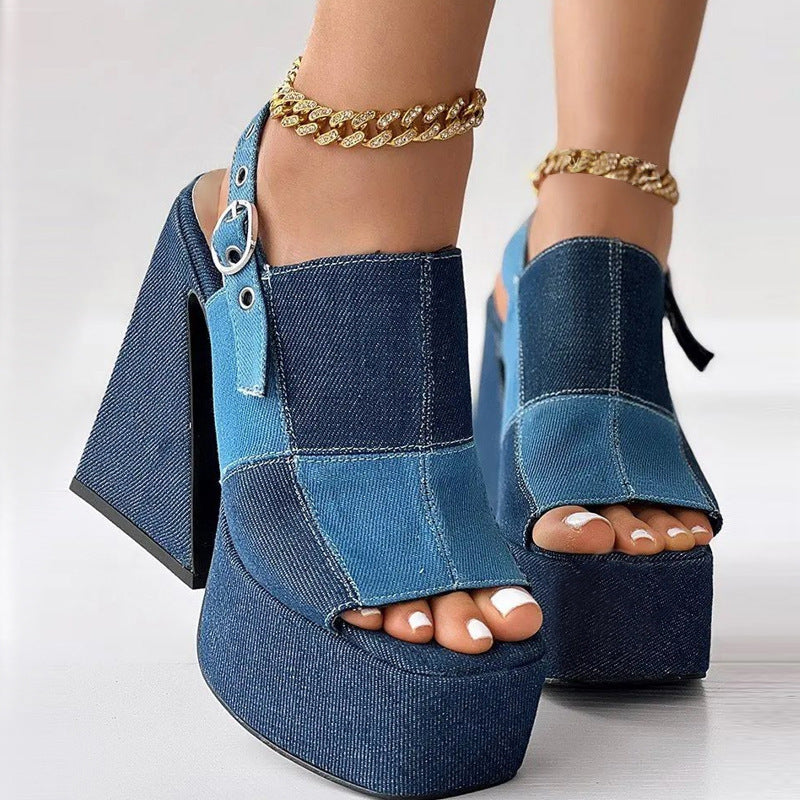 Le style est dans votre jean ! Ces talons blocs en denim rehaussent toutes vos tenues. Ils sont dotés d'un bout rond ouvert, d'une large bride supérieure avec surpiqûres classiques, d'un œillet métallique, d'une bride arrière à la cheville avec fermeture à boucle et d'une semelle compensée épaisse. Complétez votre look avec une combinaison sensuelle pour une soirée !